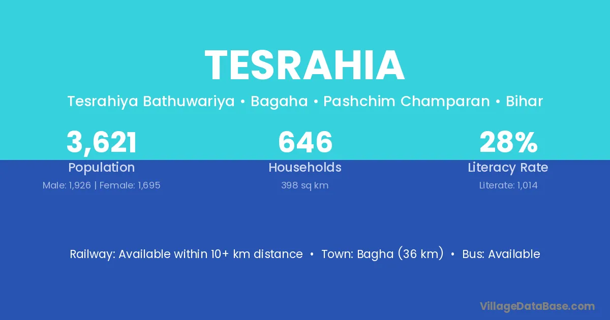 Bagha (36 km) is the nearest town to Tesrahia village for major economic activities and is located approximately 36 km away.