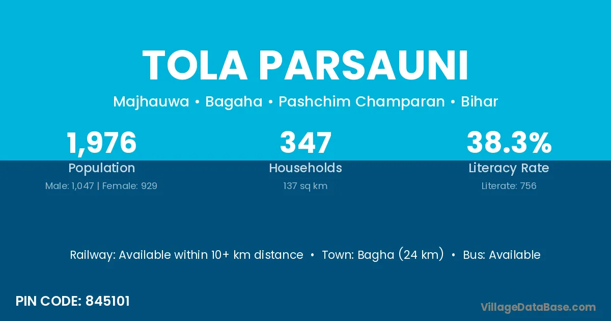 Bagha (24 km) is the nearest town to Tola Parsauni village for major economic activities and is located approximately 24 km away.