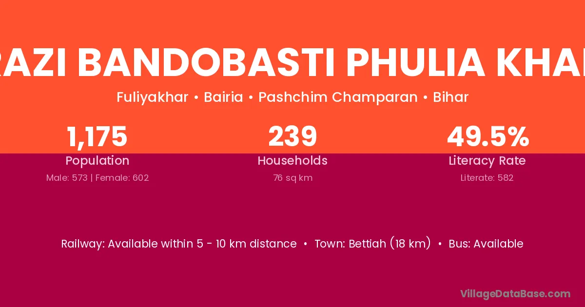 Bettiah (18 km) is the nearest town to Arazi Bandobasti Phulia Khanr village for major economic activities and is located approximately 18 km away.
