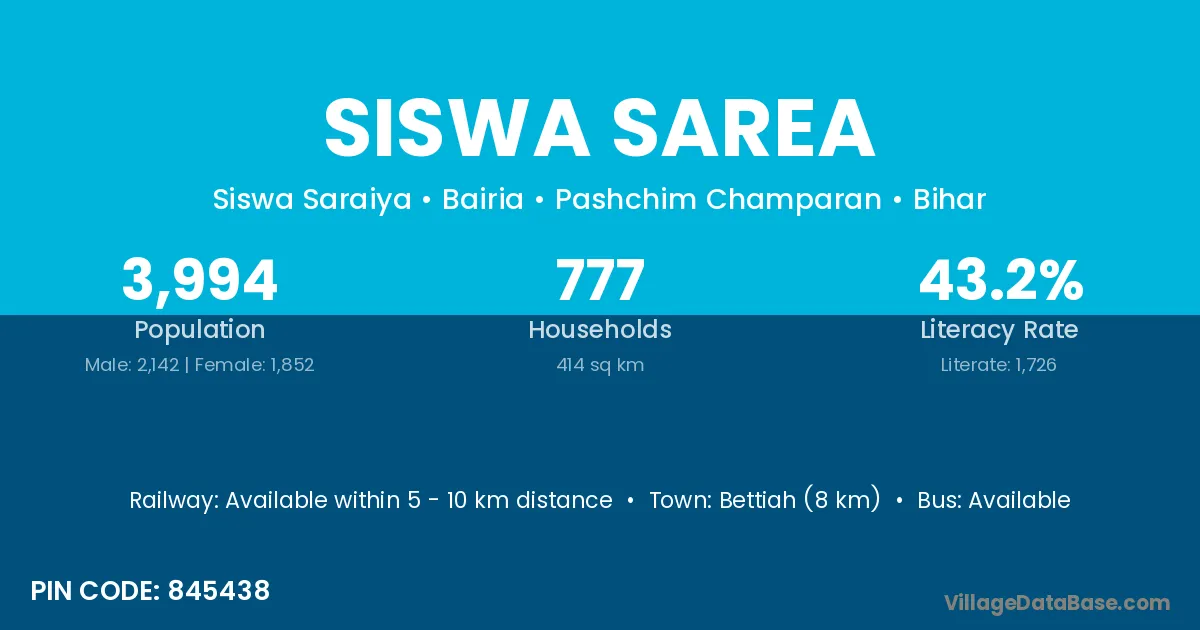 Bettiah (8 km) is the nearest town to Siswa Sarea village for major economic activities and is located approximately 8 km away.