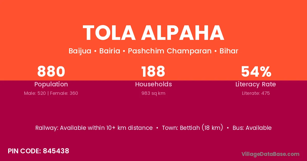 Bettiah (18 km) is the nearest town to Tola Alpaha village for major economic activities and is located approximately 18 km away.