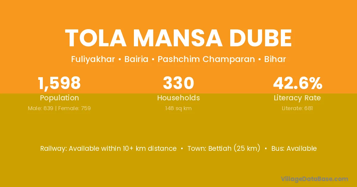 Bettiah (25 km) is the nearest town to Tola Mansa Dube village for major economic activities and is located approximately 25 km away.