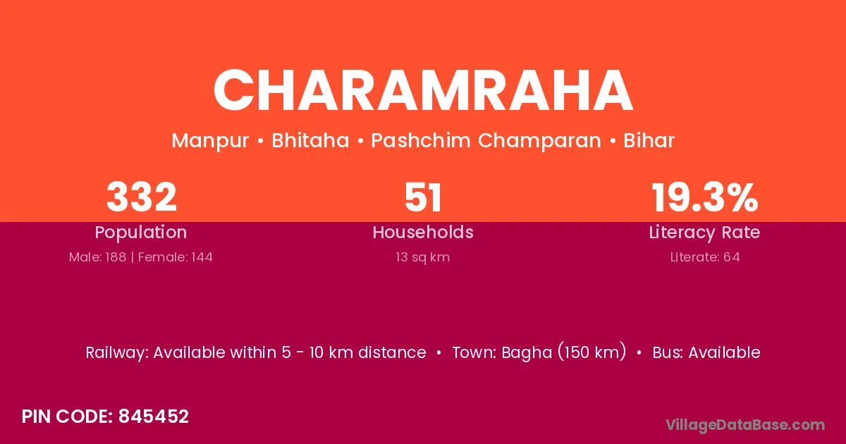 Bagha (150 km) is the nearest town to Charamraha village for major economic activities and is located approximately 150 km away.