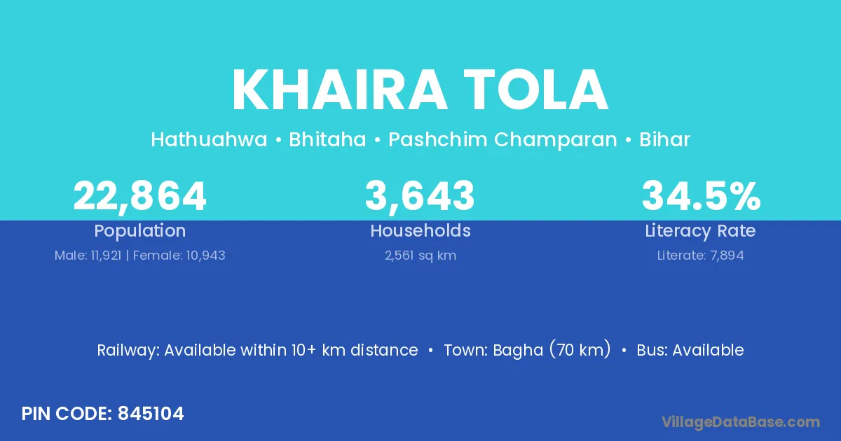 According to Census 2011 information, the village code of Khaira Tola village is 845104.