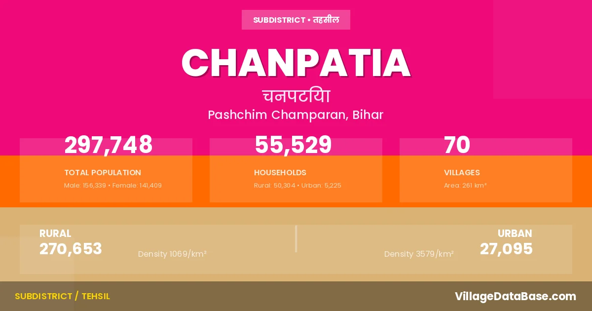 According to the 2011 census The total area of Chanpatia Subdivision is 261 km², with a population of 297748 people. The population density is 1,142 inhabitants per square kilometre, and there are approximately 55529 houses in the sub district.