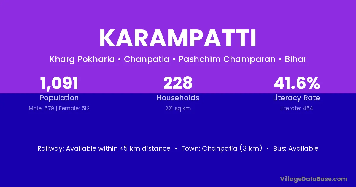 Chanpatia (3 km) is the nearest town to Karampatti village for major economic activities and is located approximately 3 km away.