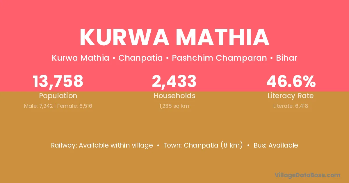 Chanpatia (8 km) is the nearest town to Kurwa Mathia village for major economic activities and is located approximately 8 km away.