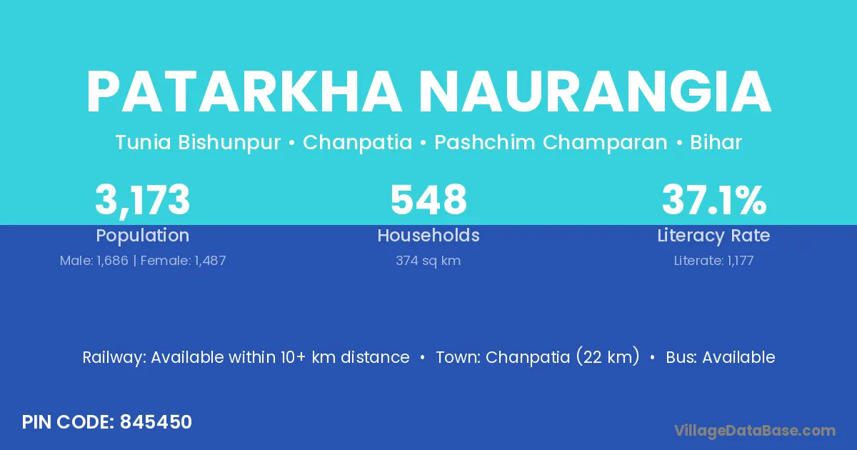 Chanpatia (22 km) is the nearest town to Patarkha Naurangia village for major economic activities and is located approximately 22 km away.