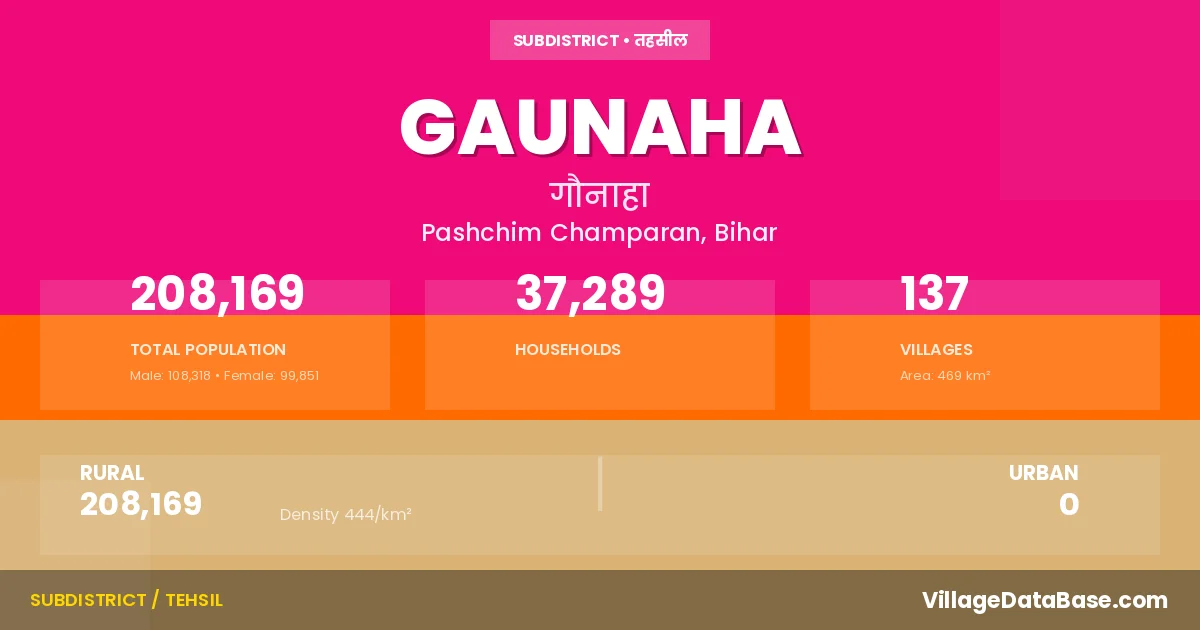 According to the 2011 census The total area of Gaunaha Subdivision is 469 km², with a population of 208169 people. The population density is 444 inhabitants per square kilometre, and there are approximately 37289 houses in the sub district.