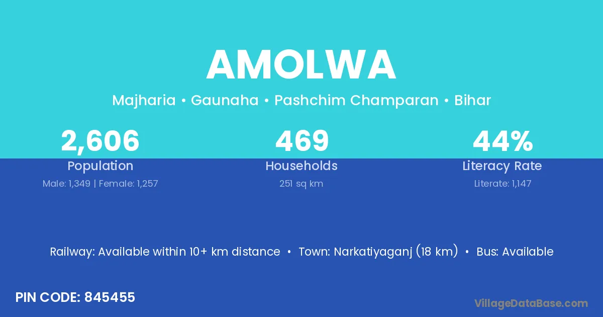 Narkatiyaganj (18 km) is the nearest town to Amolwa village for major economic activities and is located approximately 18 km away.