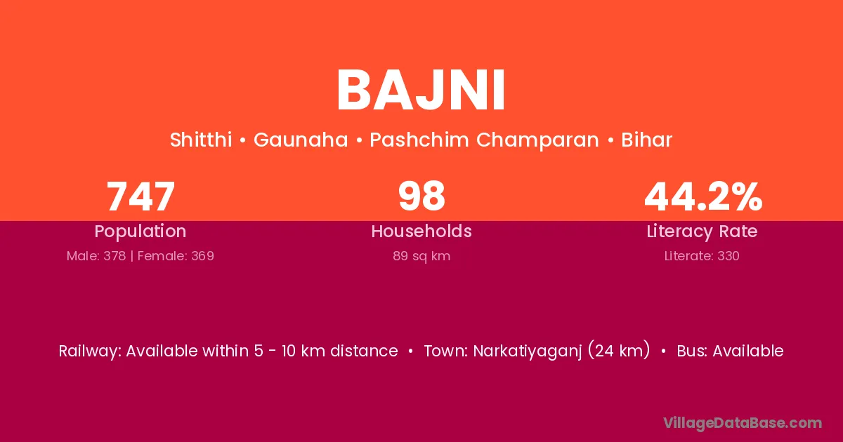 Narkatiyaganj (24 km) is the nearest town to Bajni village for major economic activities and is located approximately 24 km away.