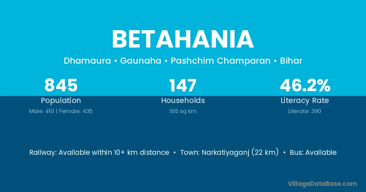 Narkatiyaganj (22 km) is the nearest town to Betahania village for major economic activities and is located approximately 22 km away.