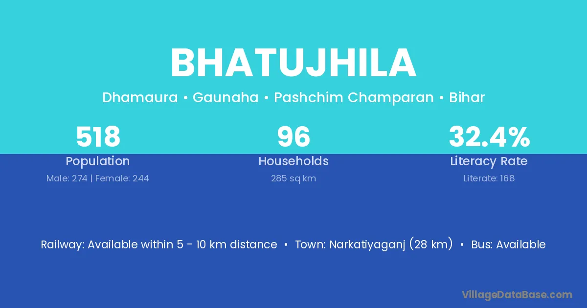 Narkatiyaganj (28 km) is the nearest town to Bhatujhila village for major economic activities and is located approximately 28 km away.