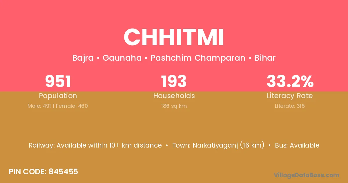 Narkatiyaganj (16 km) is the nearest town to Chhitmi village for major economic activities and is located approximately 16 km away.