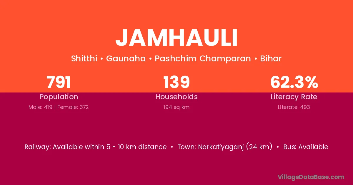 Narkatiyaganj (24 km) is the nearest town to Jamhauli village for major economic activities and is located approximately 24 km away.