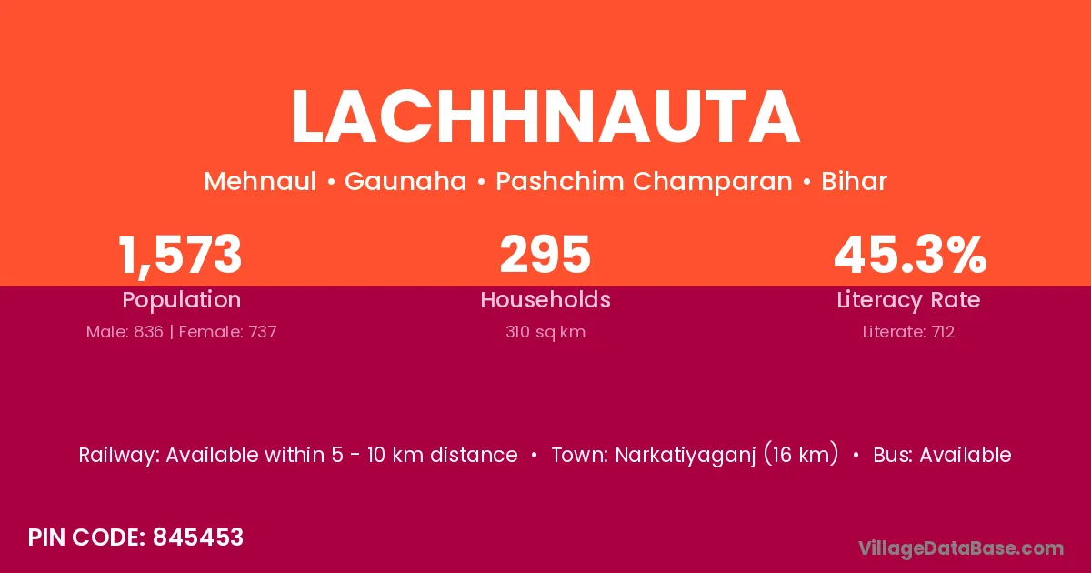 Narkatiyaganj (16 km) is the nearest town to Lachhnauta village for major economic activities and is located approximately 16 km away.