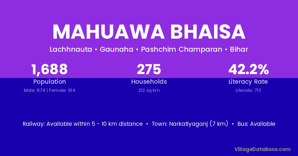 Narkatiyaganj (7 km) is the nearest town to Mahuawa Bhaisa village for major economic activities and is located approximately 7 km away.