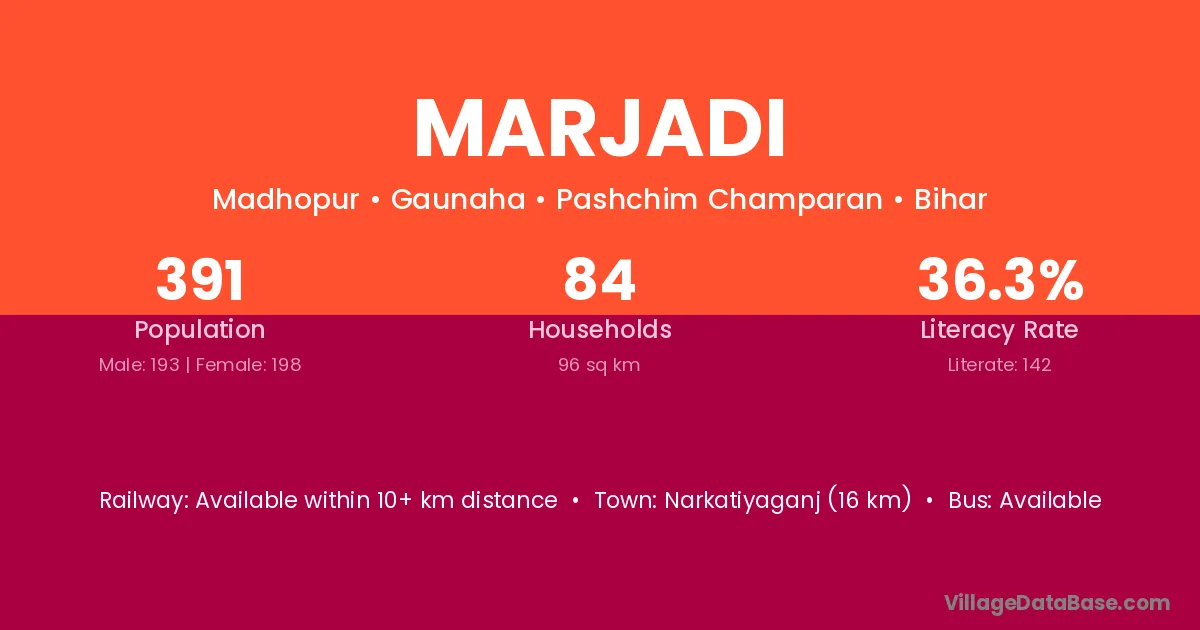 Narkatiyaganj (16 km) is the nearest town to Marjadi village for major economic activities and is located approximately 16 km away.