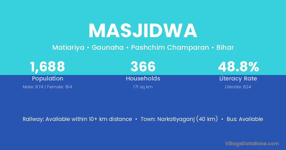 Narkatiyaganj (40 km) is the nearest town to Masjidwa village for major economic activities and is located approximately 40 km away.