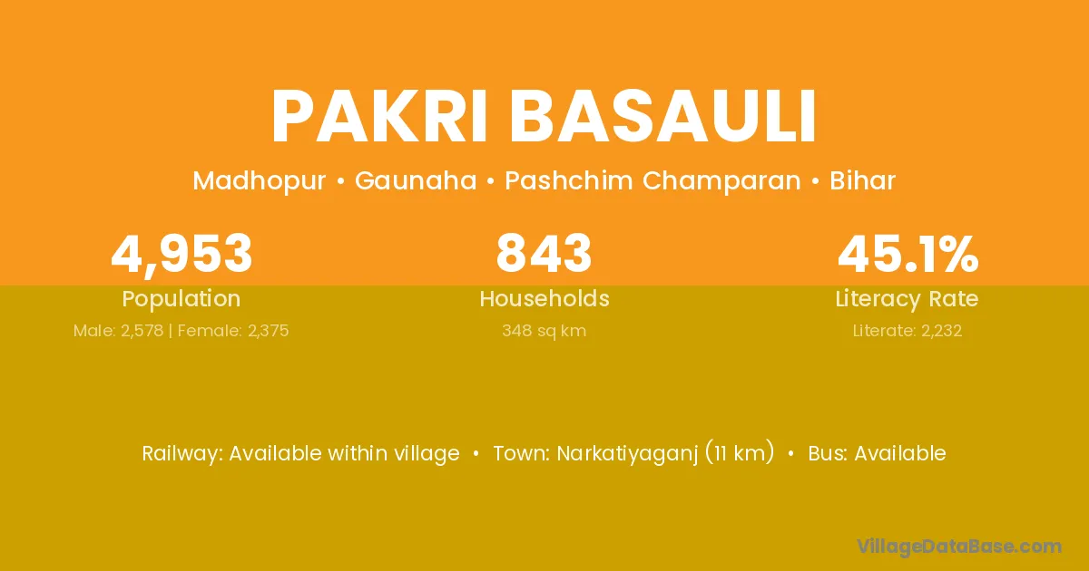 Narkatiyaganj (11 km) is the nearest town to Pakri Basauli village for major economic activities and is located approximately 11 km away.