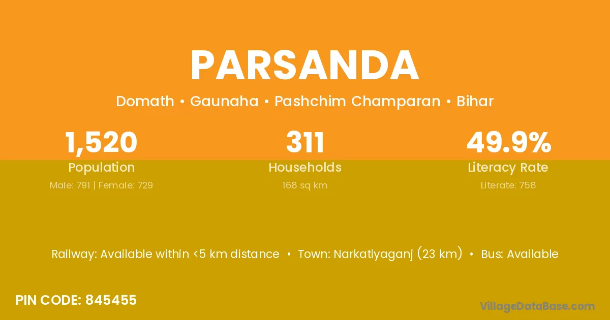 Narkatiyaganj (23 km) is the nearest town to Parsanda village for major economic activities and is located approximately 23 km away.