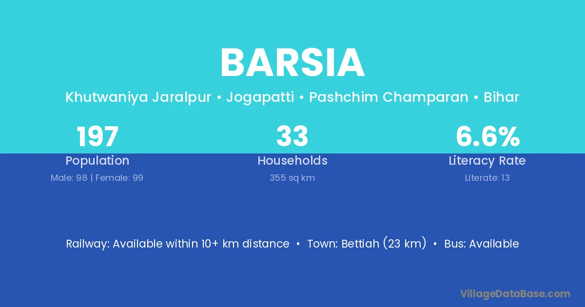 Bettiah (23 km) is the nearest town to Barsia village for major economic activities and is located approximately 23 km away.