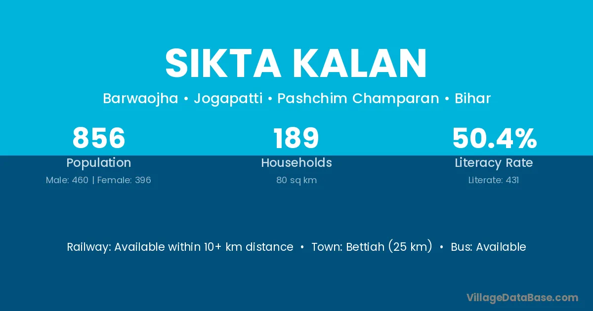 Bettiah (25 km) is the nearest town to Sikta Kalan village for major economic activities and is located approximately 25 km away.