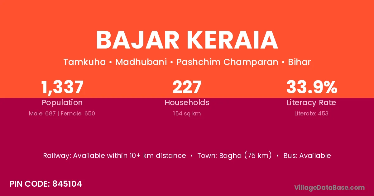 Bagha (75 km) is the nearest town to Bajar Keraia village for major economic activities and is located approximately 75 km away.