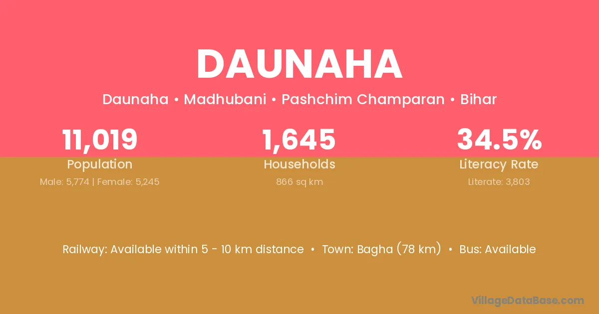 Bagha (78 km) is the nearest town to Daunaha village for major economic activities and is located approximately 78 km away.