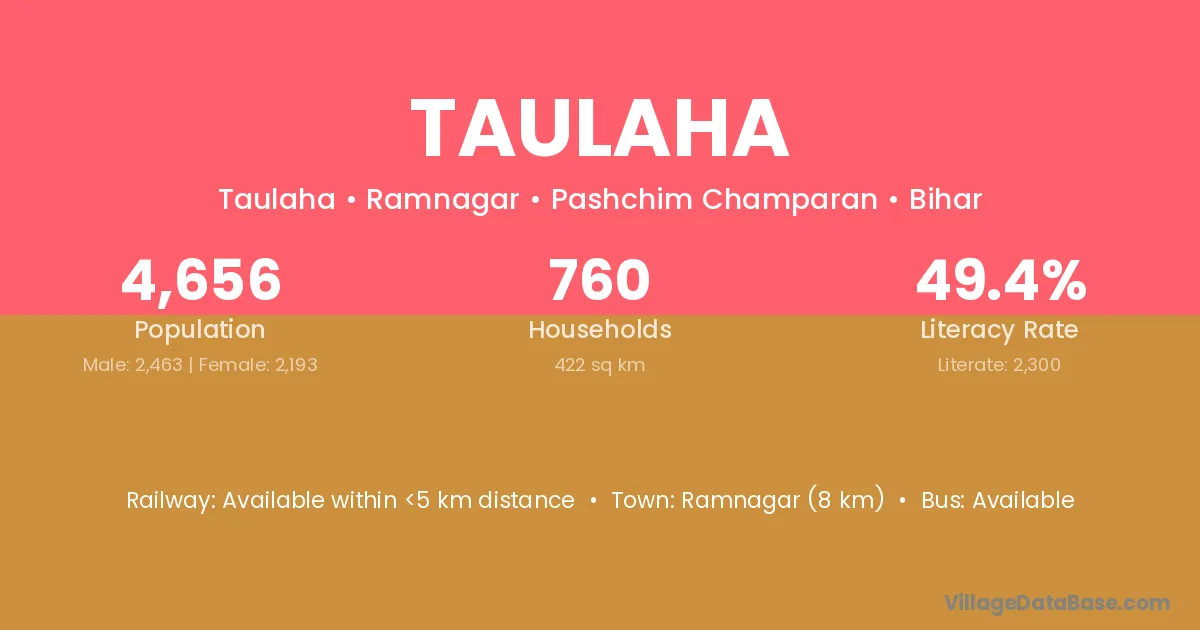 Bagha (75 km) is the nearest town to Taulaha village for major economic activities and is located approximately 75 km away.