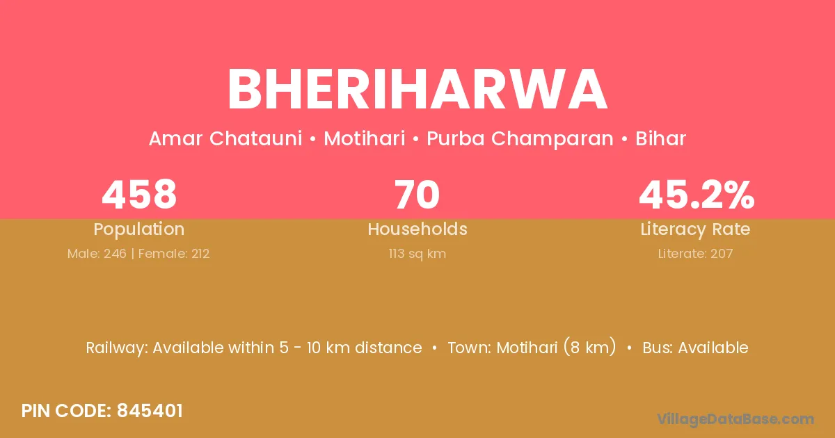 Narkatiyaganj (25 km) is the nearest town to Bheriharwa village for major economic activities and is located approximately 25 km away.