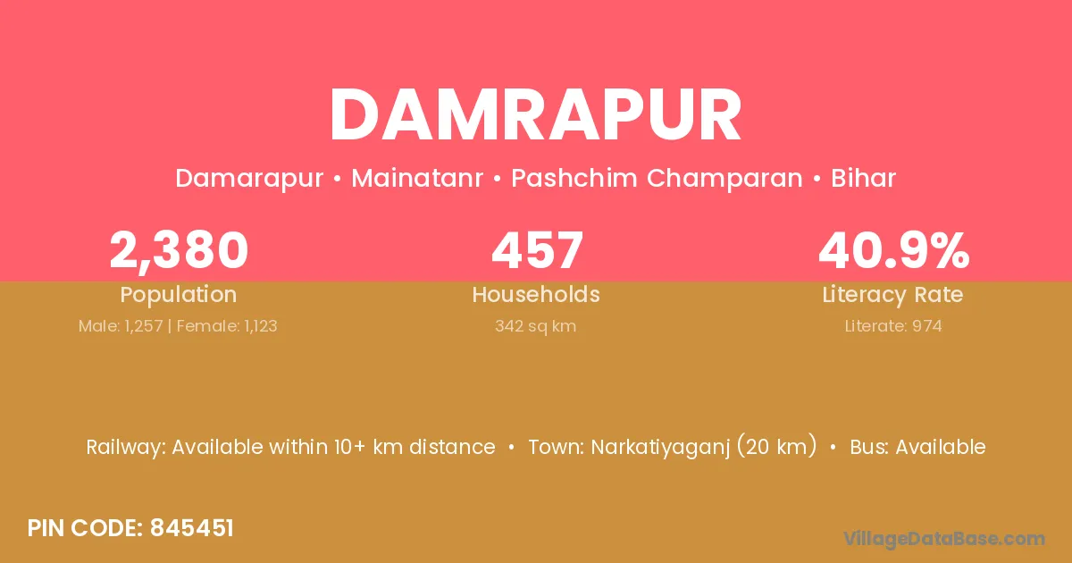 Narkatiyaganj (20 km) is the nearest town to Damrapur village for major economic activities and is located approximately 20 km away.