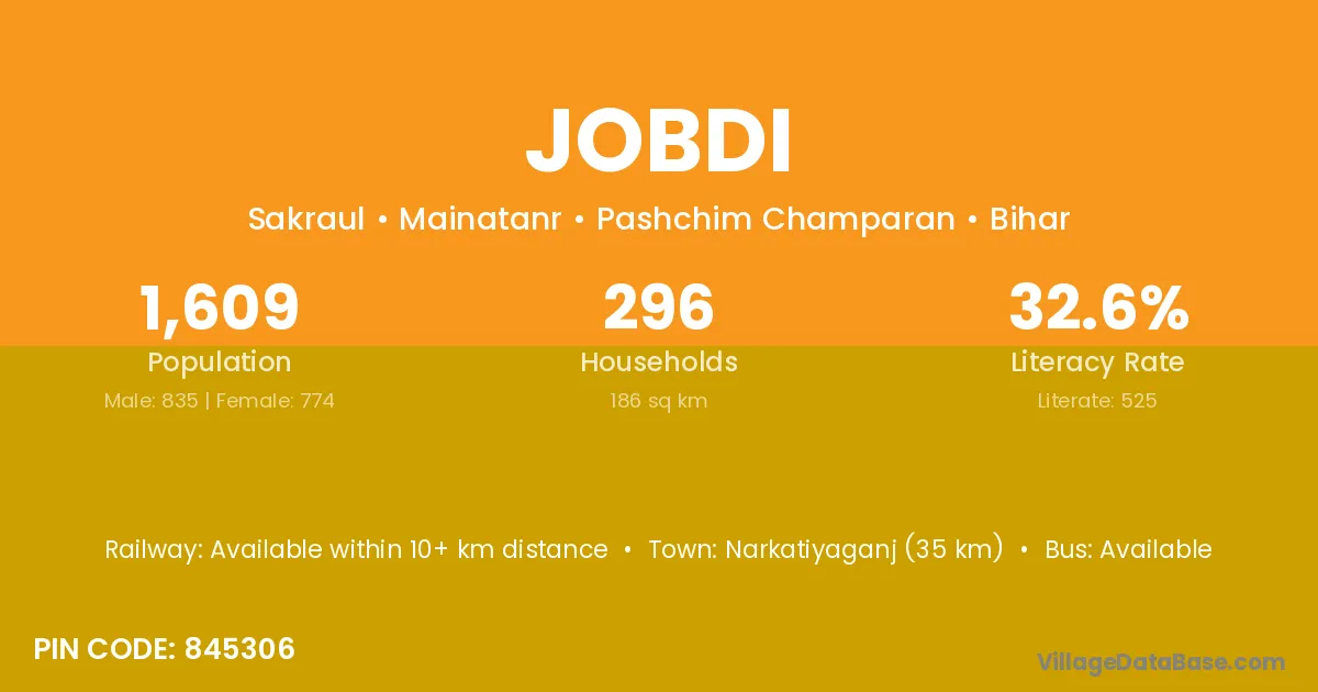 Narkatiyaganj (35 km) is the nearest town to Jobdi village for major economic activities and is located approximately 35 km away.