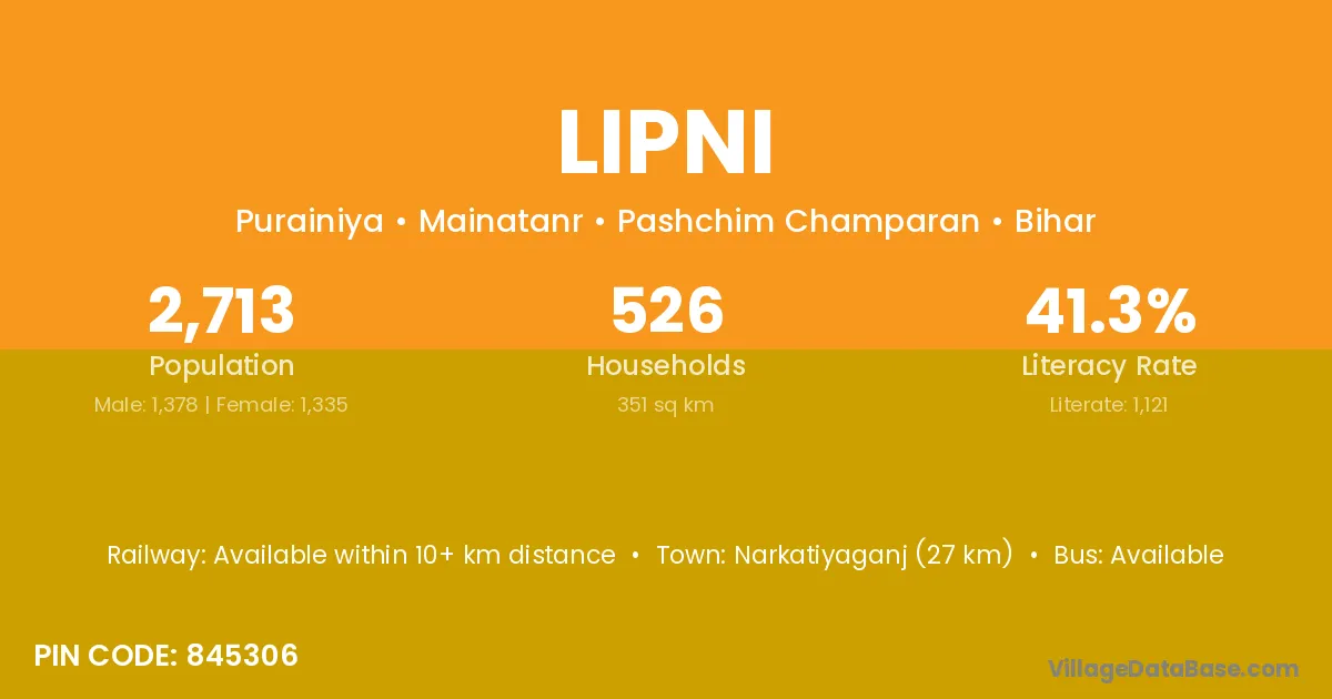 Narkatiyaganj (27 km) is the nearest town to Lipni village for major economic activities and is located approximately 27 km away.