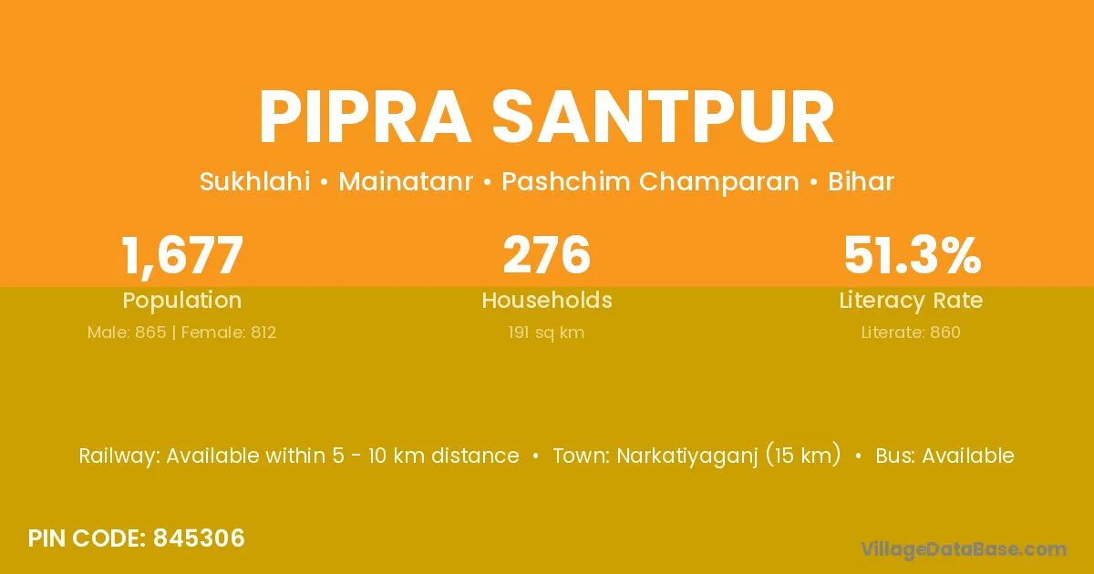 Narkatiyaganj (15 km) is the nearest town to Pipra Santpur village for major economic activities and is located approximately 15 km away.