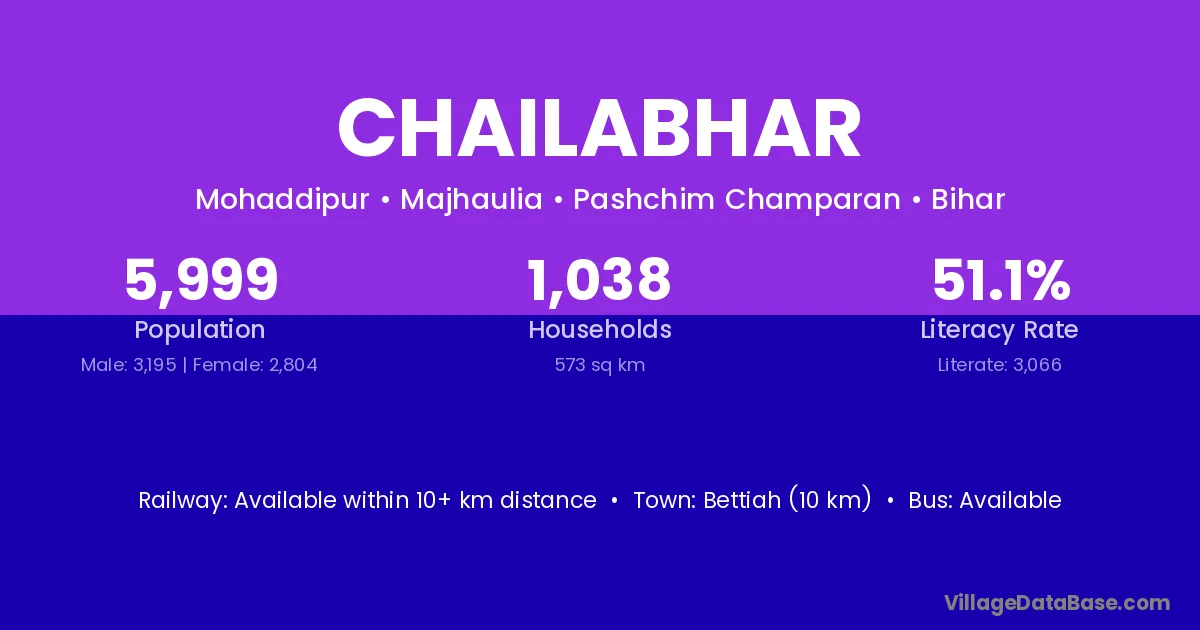 Bettiah (10 km) is the nearest town to Chailabhar village for major economic activities and is located approximately 10 km away.