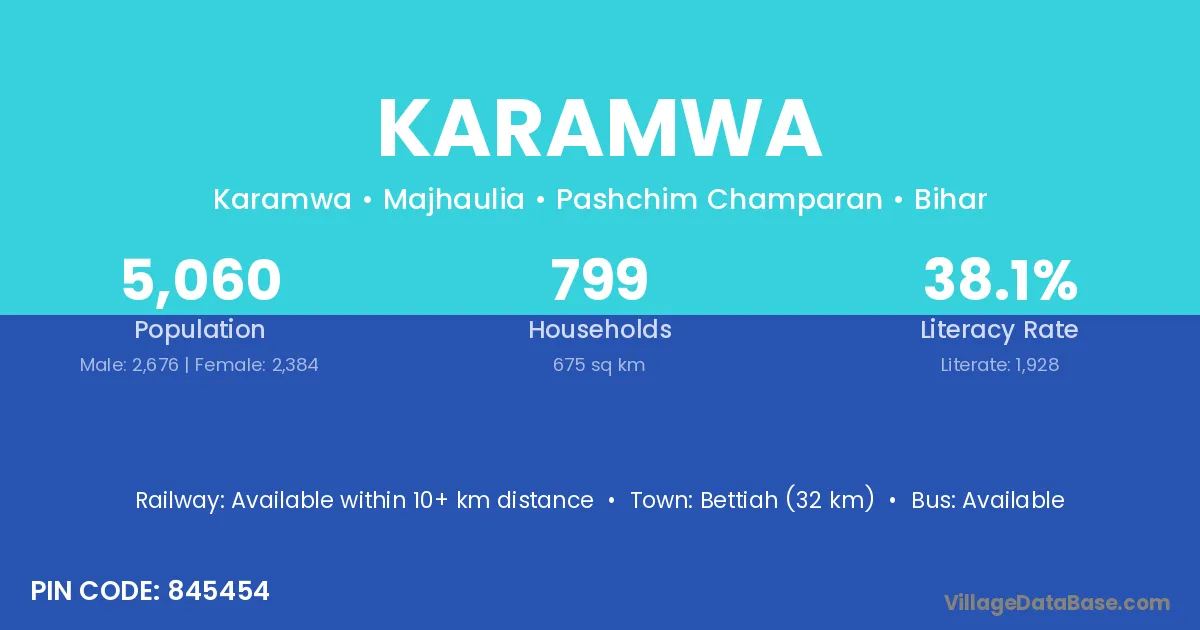 Bettiah (32 km) is the nearest town to Karamwa village for major economic activities and is located approximately 32 km away.