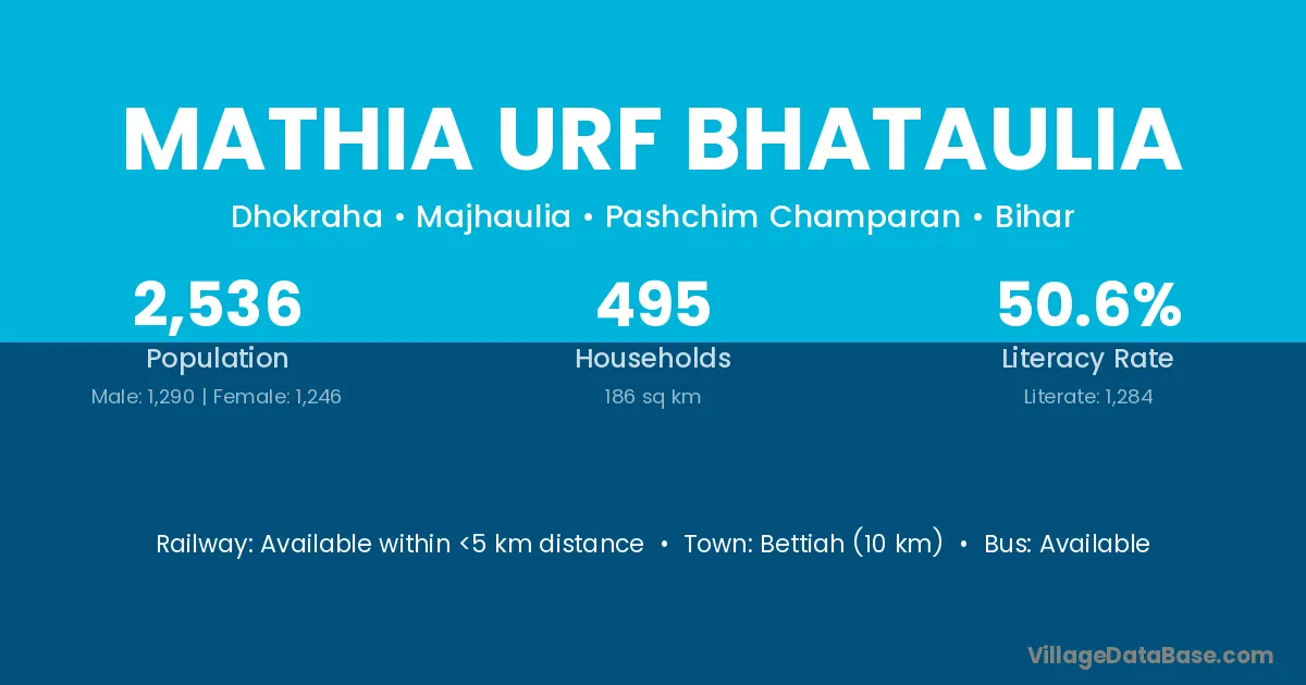 Bettiah (10 km) is the nearest town to Mathia Urf Bhataulia village for major economic activities and is located approximately 10 km away.