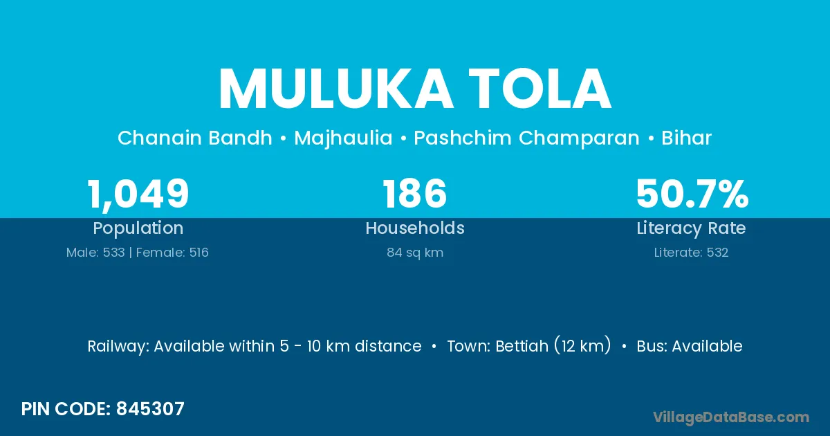 Bettiah (12 km) is the nearest town to Muluka Tola village for major economic activities and is located approximately 12 km away.