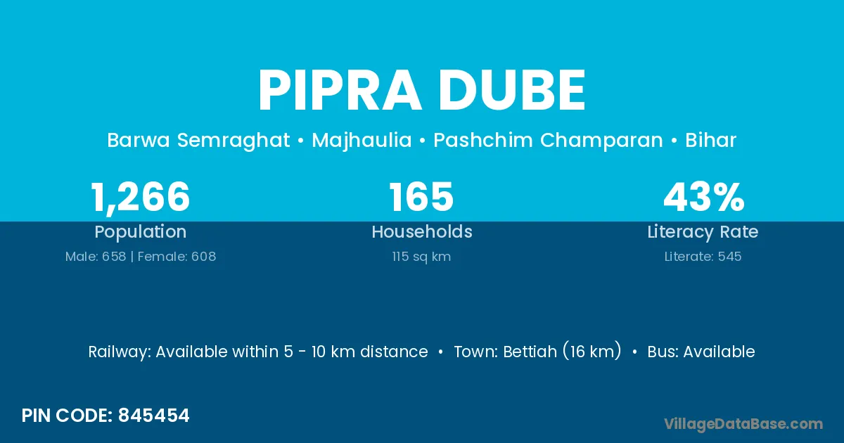 Bettiah (16 km) is the nearest town to Pipra Dube village for major economic activities and is located approximately 16 km away.