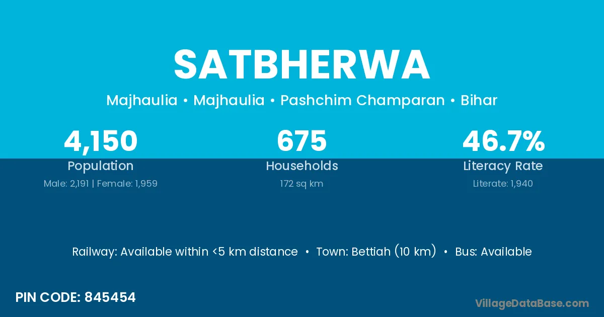 Bettiah (10 km) is the nearest town to Satbherwa village for major economic activities and is located approximately 10 km away.