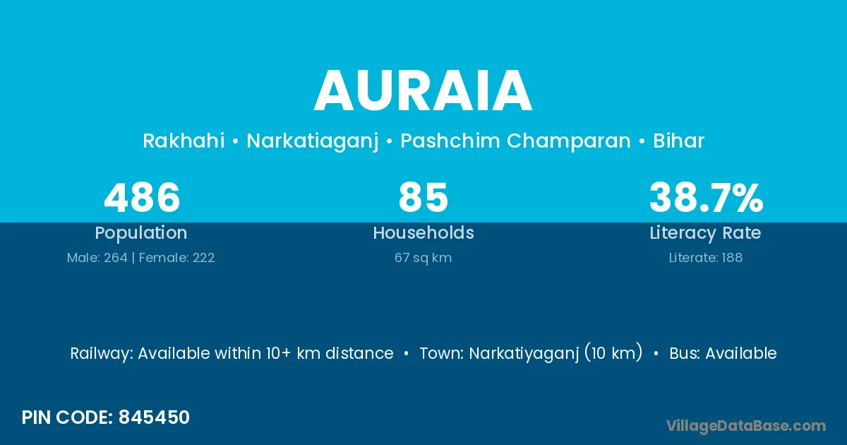 Narkatiyaganj (10 km) is the nearest town to Auraia village for major economic activities and is located approximately 10 km away.