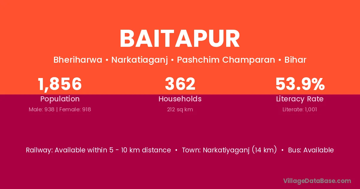 Baitapur village has a total population of 1,856 people, of which 938 are males and 918 are females.