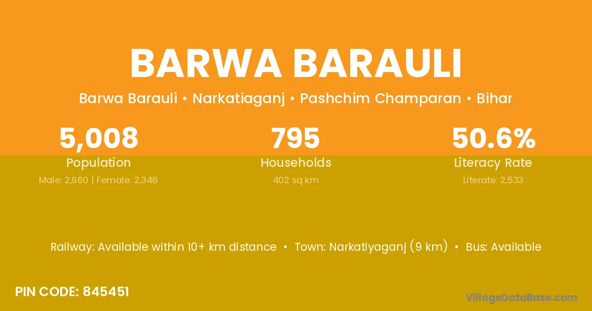 Narkatiyaganj (9 km) is the nearest town to Barwa Barauli village for major economic activities and is located approximately 9 km away.