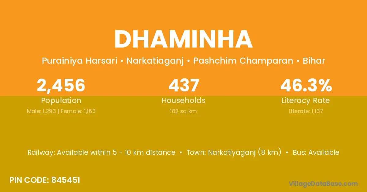 Narkatiyaganj (8 km) is the nearest town to Dhaminha village for major economic activities and is located approximately 8 km away.