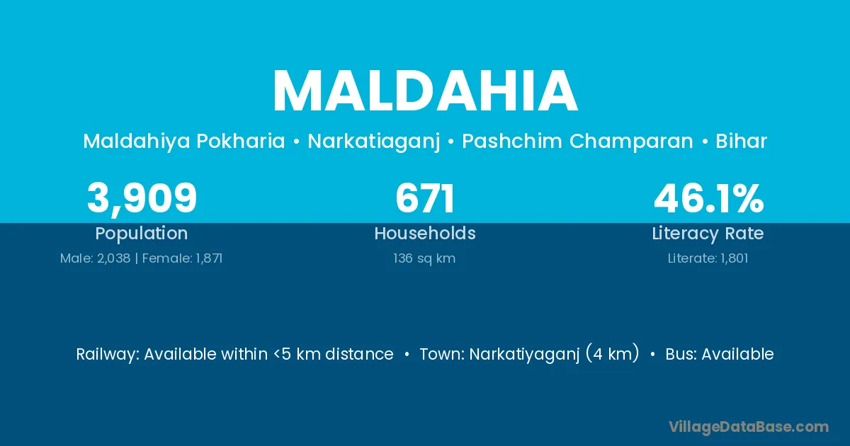 Narkatiyaganj (4 km) is the nearest town to Maldahia village for major economic activities and is located approximately 4 km away.