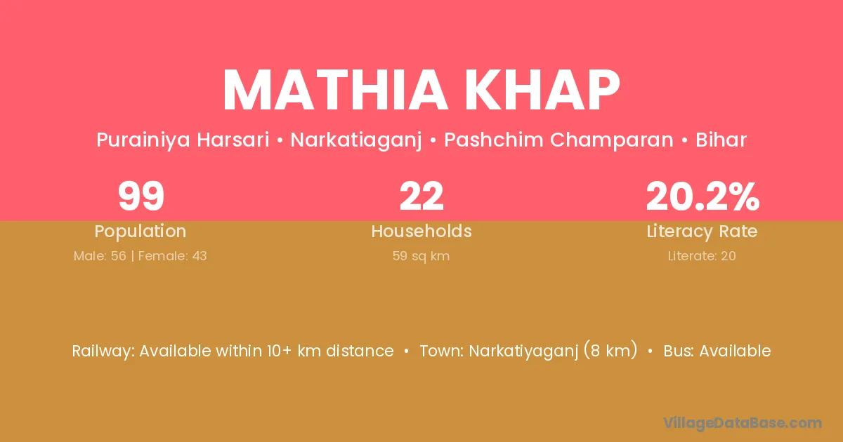 Narkatiyaganj (8 km) is the nearest town to Mathia Khap village for major economic activities and is located approximately 8 km away.