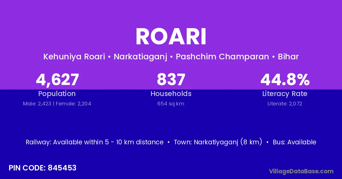 Narkatiyaganj (8 km) is the nearest town to Roari village for major economic activities and is located approximately 8 km away.