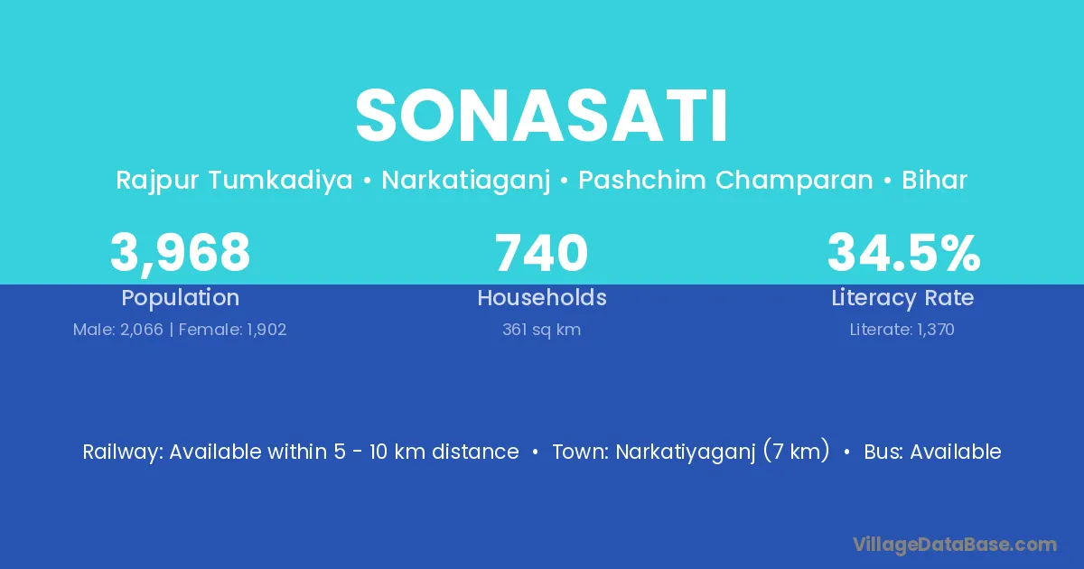 Narkatiyaganj (7 km) is the nearest town to Sonasati village for major economic activities and is located approximately 7 km away.