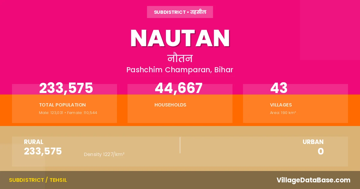 Nautan is a town and Subdivision in the Pashchim Champaran district of the Bihar. In India, a Subdivision is a subdivision of a district responsible for the administration and revenue collection of a specific area within the district. Subdivisions play a crucial role in the local governance structure, contributing significantly to the development and administration of their communities.